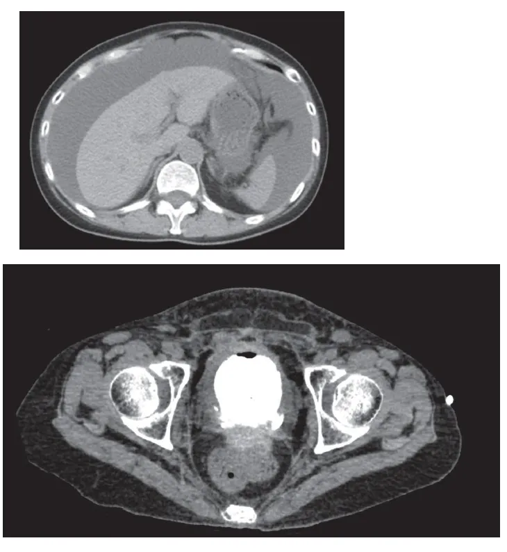Figura 2. TC abdômen mostrando as ascite e vazamento de contraste na bexiga (lado esquerdo da parede posterior da bexiga).